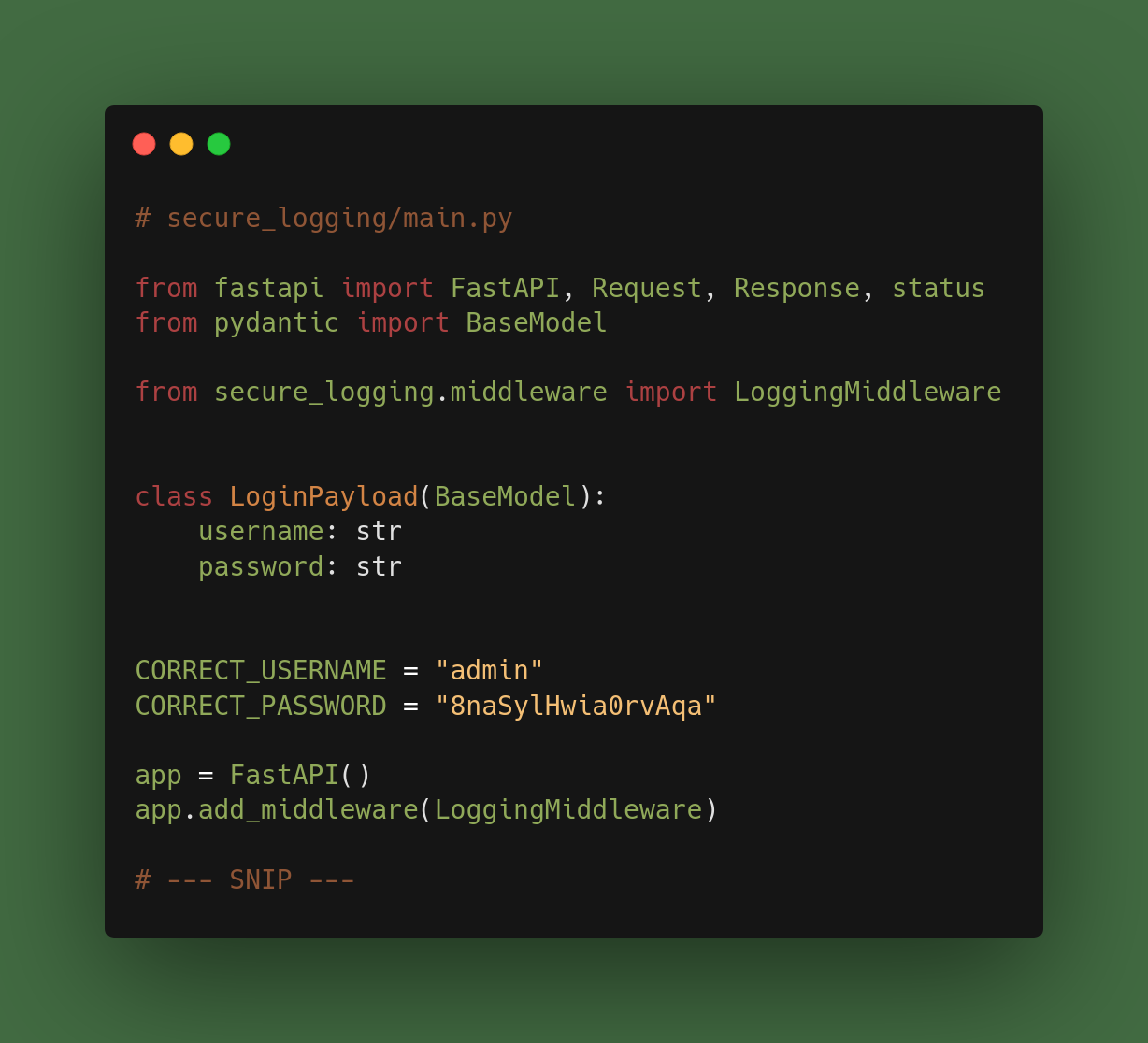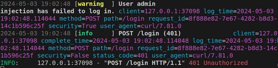 Told you it was simple. Like I said, 2 endpoints, and a plaintext set of admin credentials. This is a solid playground to test out our logging setup, both with and without user input.