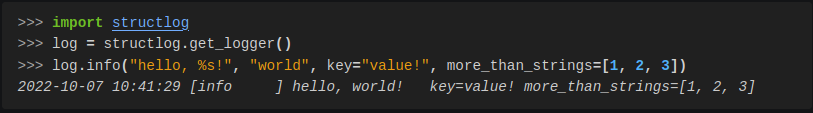 In order to assess what we want to add, we need to know what Structlog gives us by default. Their documentation provides an example: