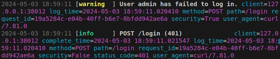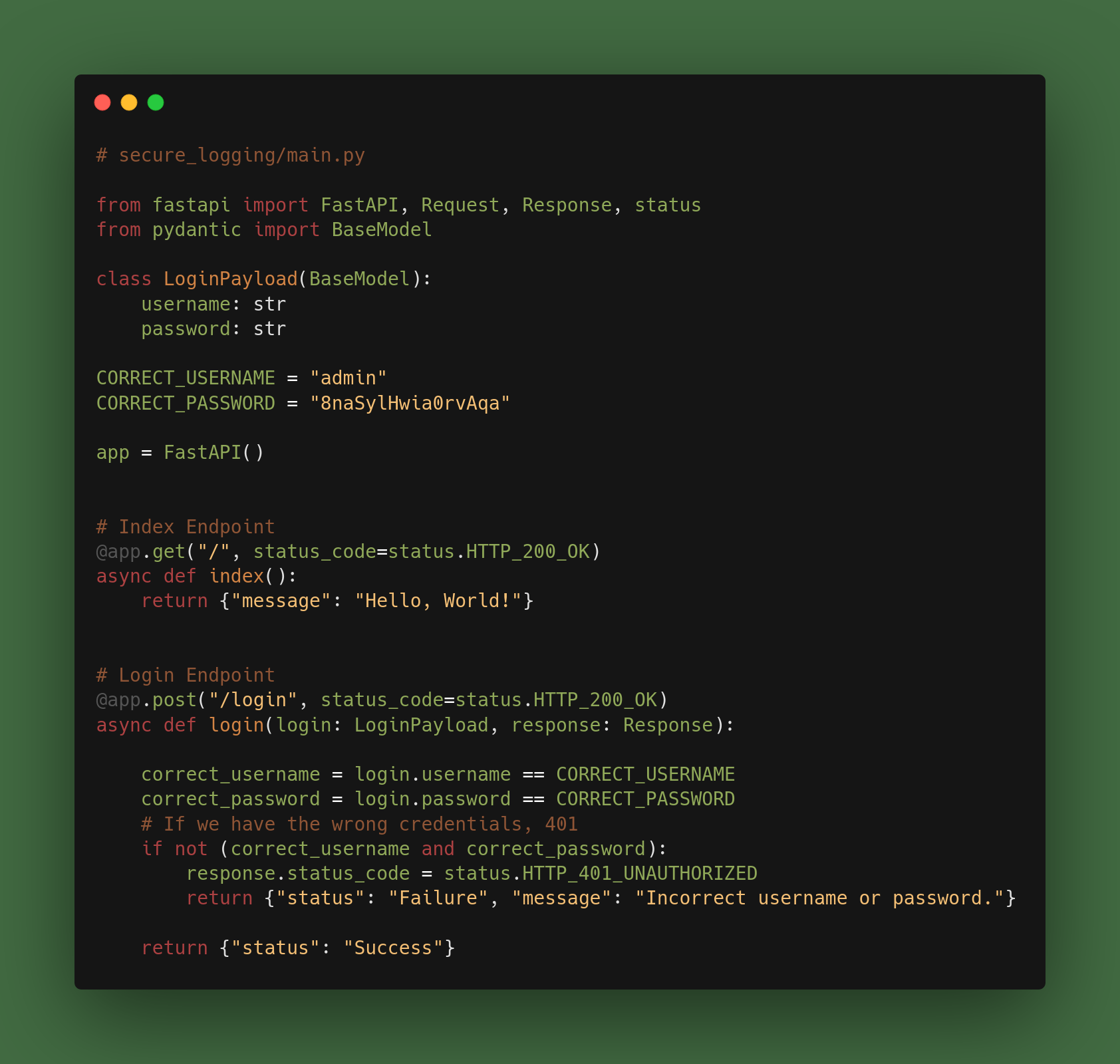 . Two endpoints: One "hello world" index endpoint, and a login endpoint. This thing doesn't even have a database, just a plaintext set of credentials to illustrate the logging. This goes without saying, but for the love of the universe don't do this in your actual projects!