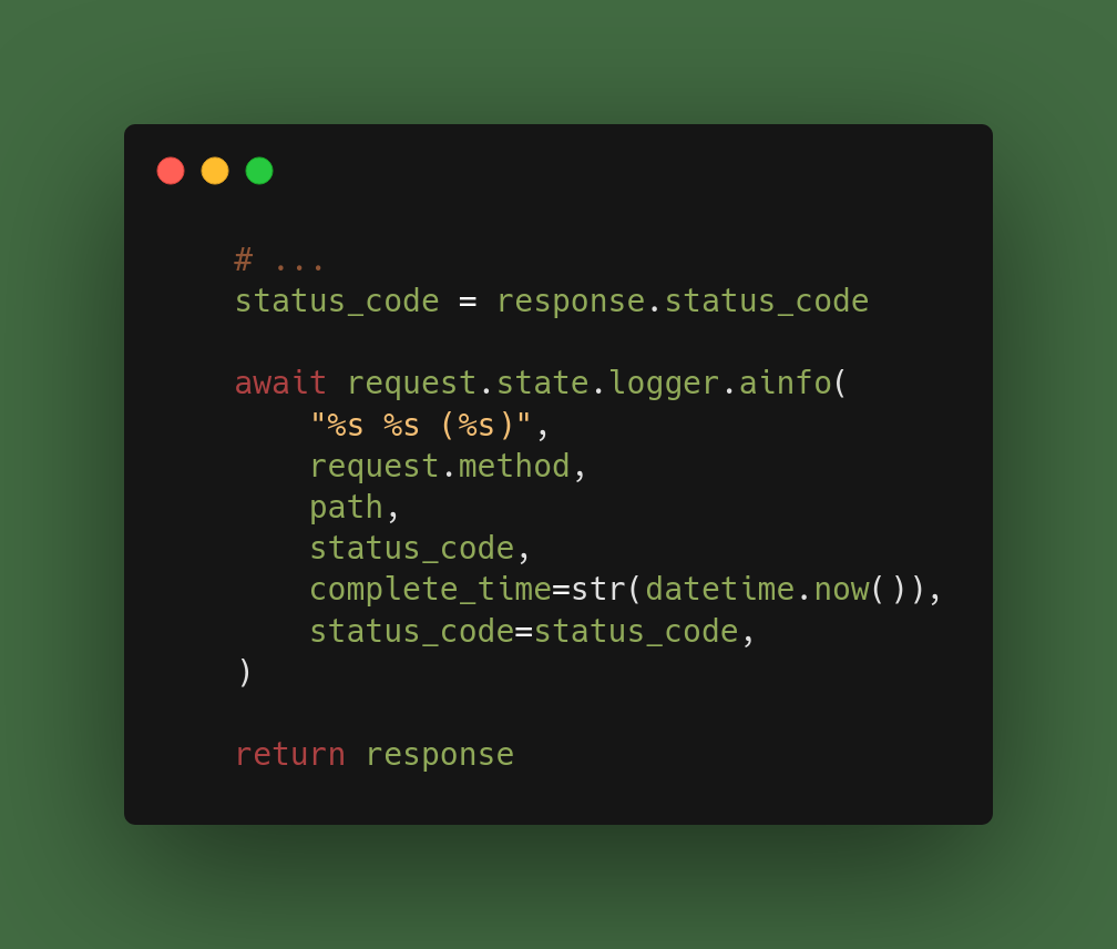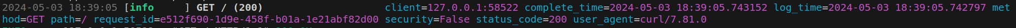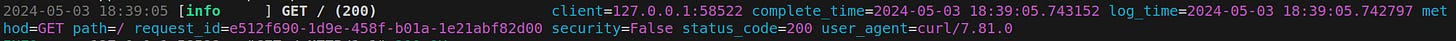 One last bit of code: I want to add a completion log entry, similar to how Uvicorn adds log entries when the request completes, to alert you of which endpoint was accessed and what the status code was. This on its own would be a pretty good drop in replacement for Uvicorn!